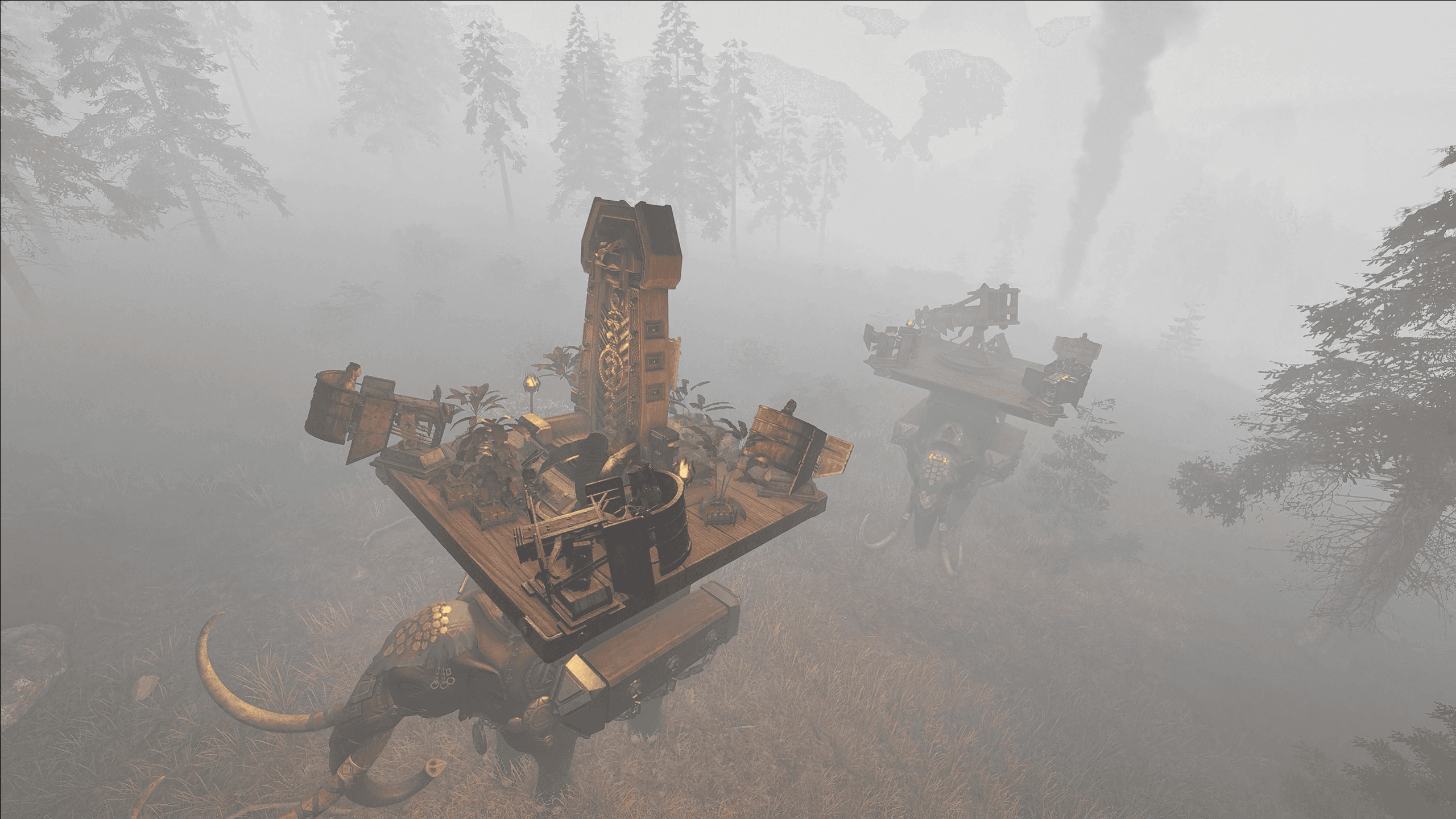 所以我们以《灵魂面甲》体型最大的生物之一:大象为基础,制作出《灵魂面甲》有史以来用途最多,也最大的坐骑平台:泡温泉?坐在王座上彰显权威?还是说与族人一起坐着稍微喝一杯热可可?在坐骑平台上你可以放置你能在营地中使用的几乎所有东西——当然,还能成为致命的攻城武器。