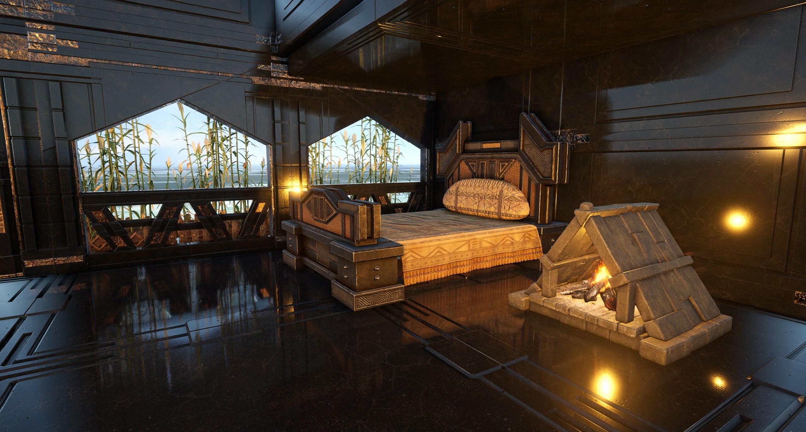 冬季室内饰品:从火塘到地毯,再到舒适的兽皮双人床。满足你对酋长的冬季生活全部想象;