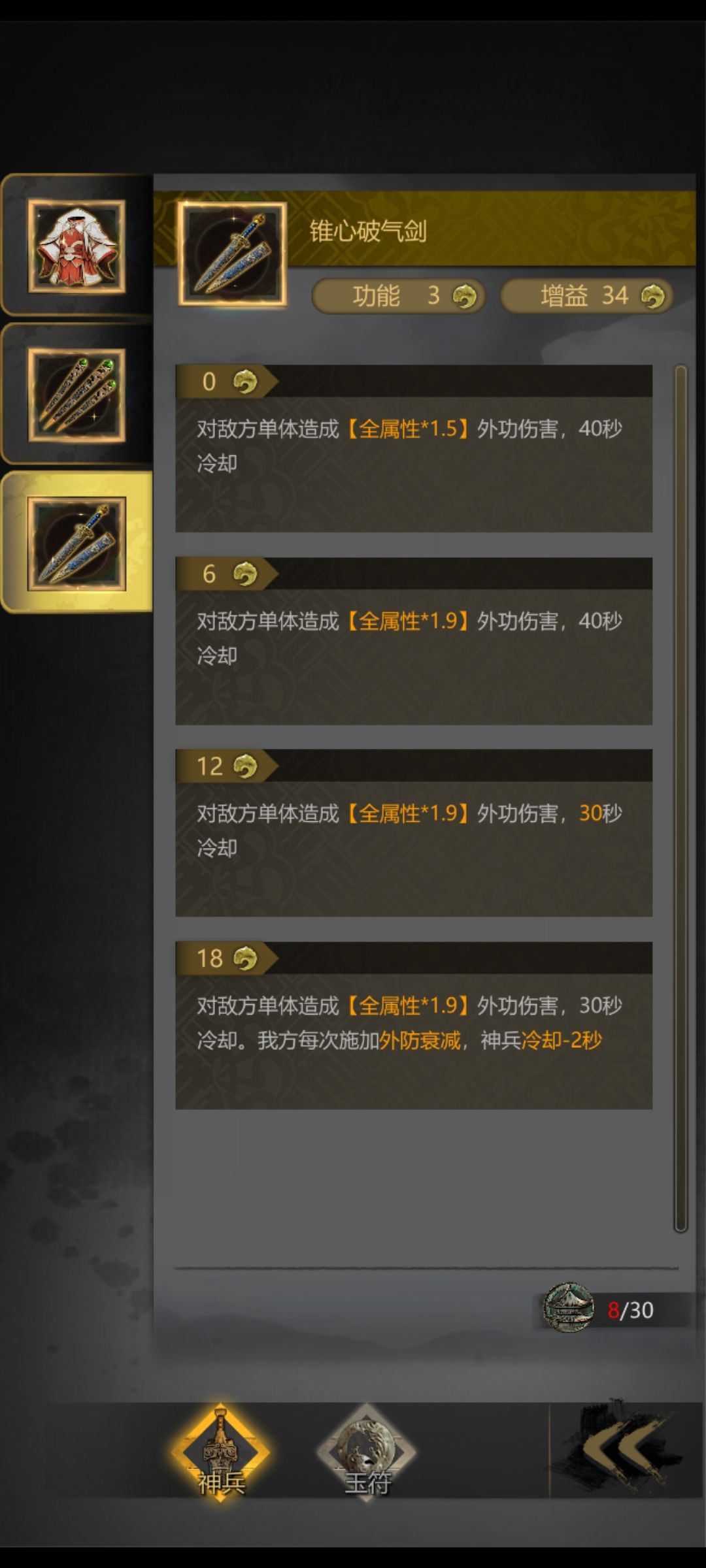 第三层难点在第三关boss要撑到神器加盾,基本就过了,boss又以外伤为主,所以三关里面的词条可选外功减伤,全伤害降低,为了增加神器伤害,也要尽量选一些加属性的词条,内力,技巧,速度等等。