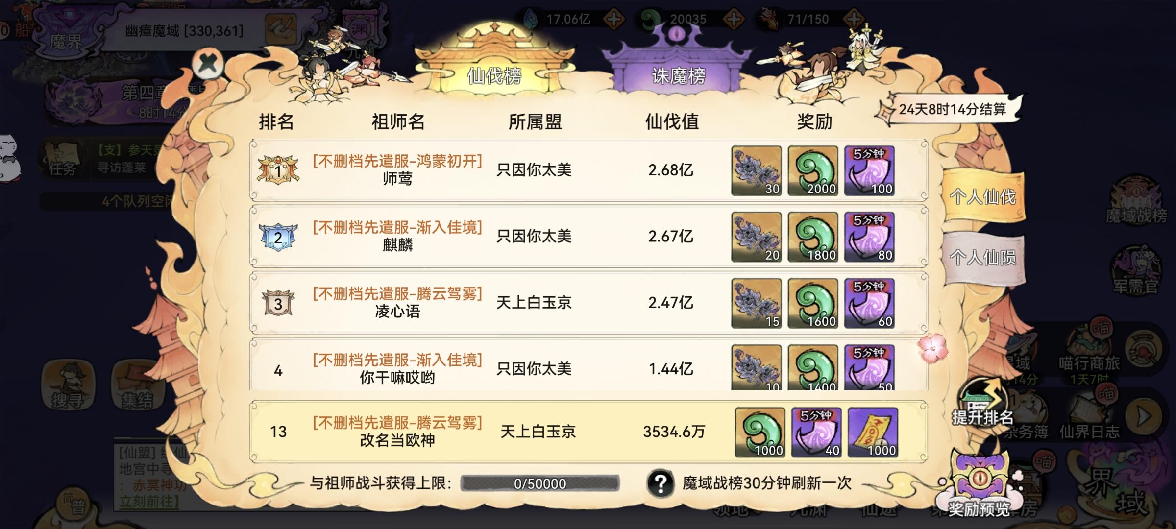 首先,他这个排行榜奖励颠倒了,这点非常重要,因为诛魔难刷分,仙伐的话分好刷,这个一颠倒的话,堡垒装扮的话,平民不用看了,在群里看到你们在刷分抢奖励的时候,我看着都想笑,以前仙伐给的是装扮,当时我们也在刷分,宗门互刷,只要死兵就猛给分,当时我去问专属客服了,给我讲的是双方是能刷的,然后你们猜猜后续是怎么改的?没错,他增加双方刷分上限,哈哈哈哈哈哈