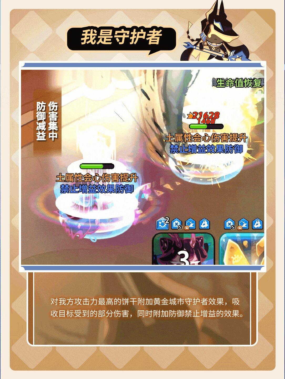 升起岩石对敌方造成伤害与眩晕,提升我方全体土属性会心伤害。使我方攻击力最高的饼干获得黄金城市守护者效果,持有效果时可免疫一次禁止增益,并代替黄金城市守护者目标承受部分伤害。当巴斯克饼干与黄金起司饼干一同出场时,提升自身攻击力与伤害减免,当黄金起司饼干进入灵盒状态时,重置自身冷却时间,并优先为黄金起司饼干灵盒套用黄金城市守护者效果。