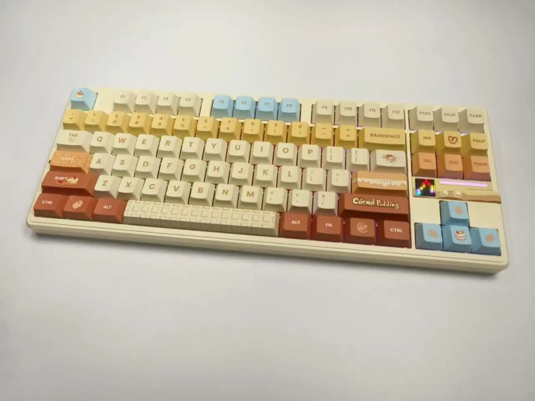 首先在外观上,这款键盘更像是客制化键盘,尤其是元气橘瓣和慕斯谧语这两个版本,键帽不论是配色还是图案颜值都相当高,并且售价都在300元价位左右,这是真把客制化键盘的价格给打下来了吧。当然,如果你不喜欢这种比较花哨风格的键盘,你可以选择购买侧刻或者雾透键帽,单键帽风格就高达六种之多。
