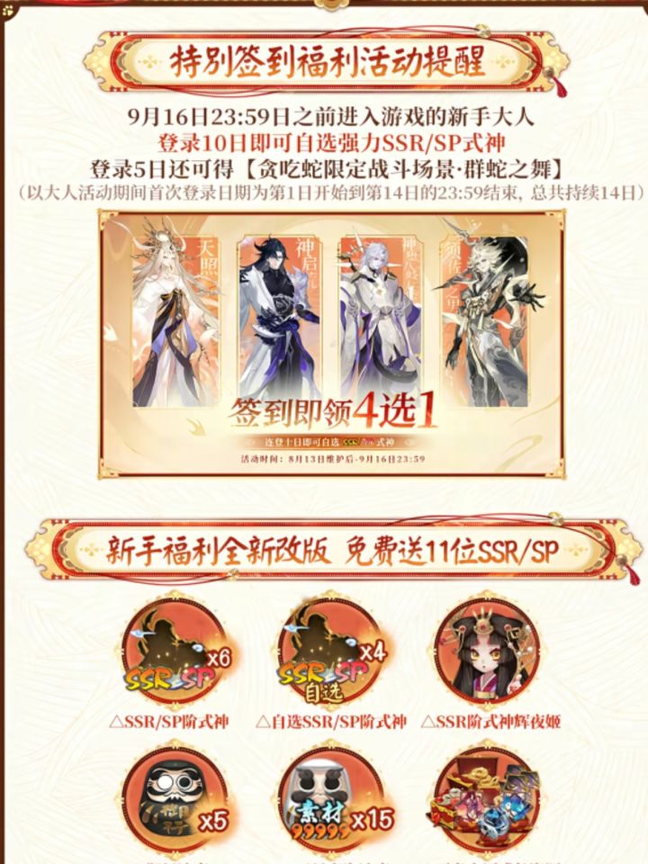 完成新手任务还能额外领3个SSR/SP,加上抽卡保底送的SSR,总共能白拿16个顶级式神 !直接阵容一步到位 好吧。