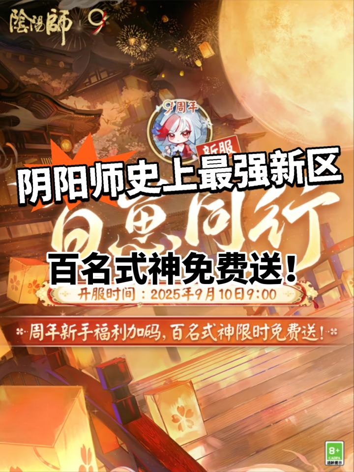 九周年特别新区「百崽同行」9月10日正式开服啦!这次官方直接开大,新手玩家登录就能免费抱走近百个式神,强力SSR/SP式神都能轻松拿到手!