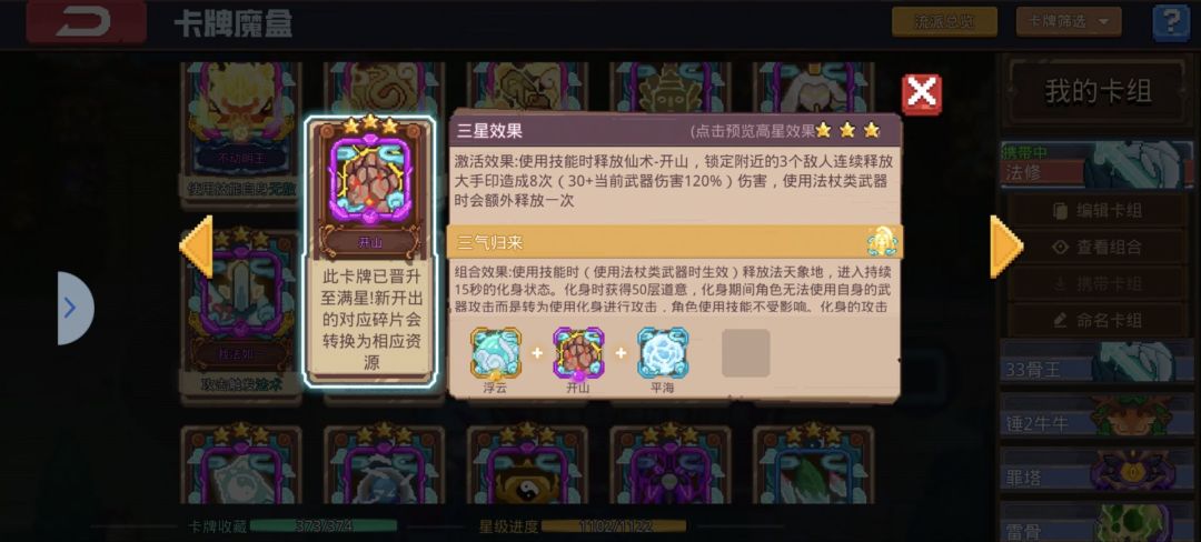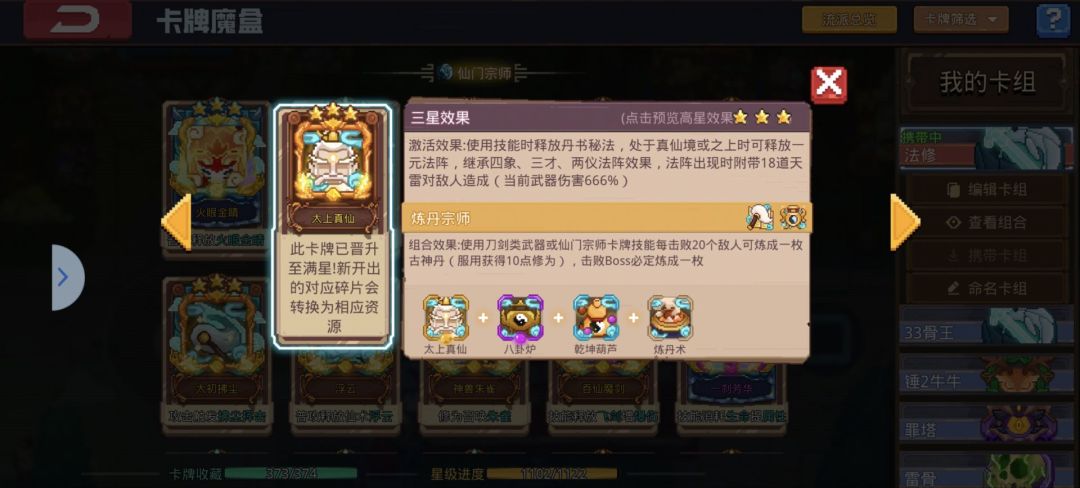 太上:放在十卡是为了尽量在三图之前点出来,0星的太上就具有定身效果,可以用于定图二boss跟定图三帝国的泥头车(图三概率出现海洋地图,森林地图,帝国地图。泥头车是什么?你碰到就懂了...)1星就可以用于炼丹了,3星更是有境界限制的超级数值输出手段666%的攻击数值!