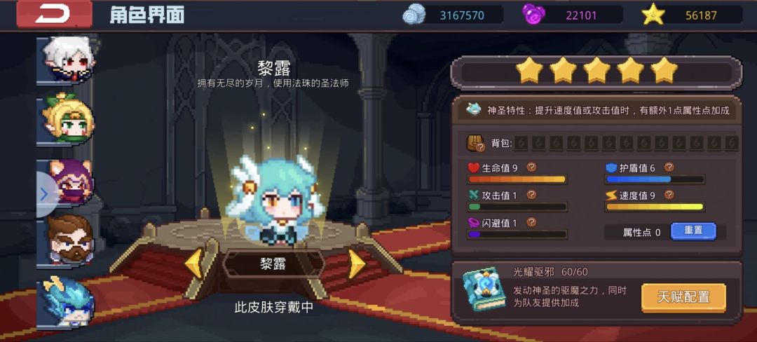 角色选黎露(都抽了一个卡池了应该已经拿下了吧。。)黎露是目前最新出的角色,性能在前面所有角色之上,加完点跟技能基本可以无痛暴力过开局小怪包括33