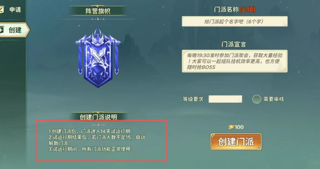如果有想当门主的朋友,门槛还是很低的,只需要花一百绑定元宝就能建立,但是要注意门派十四天内要招满十五人哦,比较快的方法是在世界频道里招募成员。也要注意,作为门主如果三天未登录是会被自动转移的。#热血江湖归来 #攻略 #新游安利局 #游戏资讯