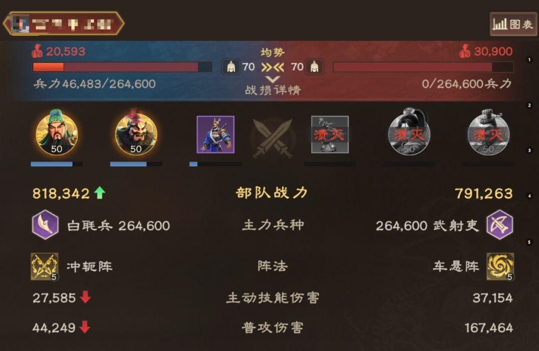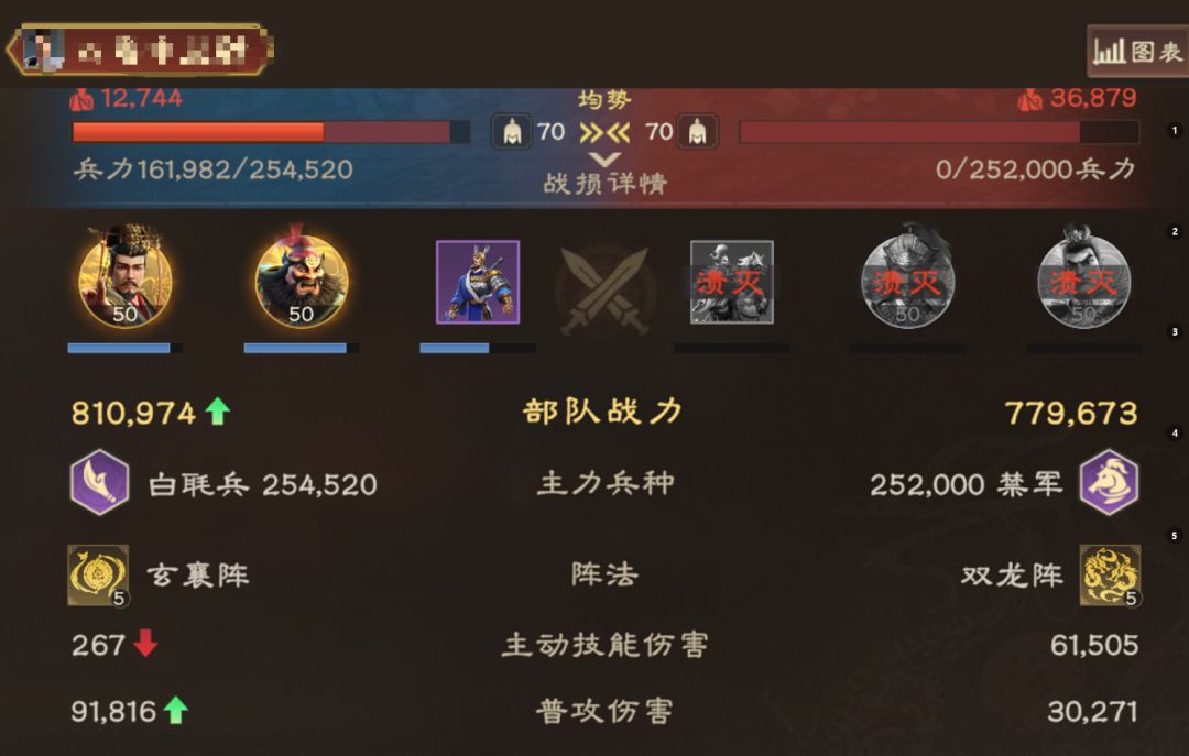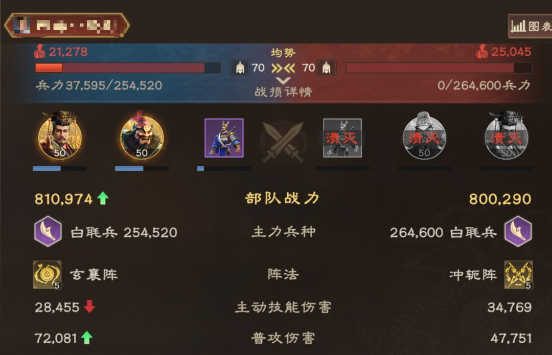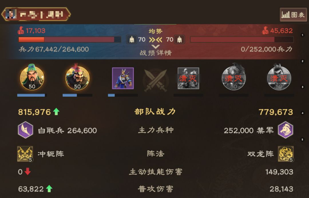 从战报中主公们可以看到,在面对张辽的技能暴击体系时,优势巨大。