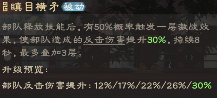 该被动可持续叠加反击伤害,为张飞的核心输出技能。叠加反击伤害后,张飞队伍反击伤害惊人,因此,需优先升级该技能。