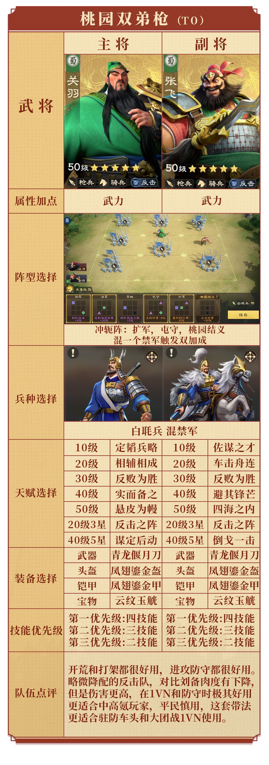 当前最强的张飞组队,刘备提供生存能力,张飞提供反击能力,同时搭配玄襄阵兼具生存和输出。张飞在团战中表现优异,适合作为驻守车头以及最前线扛线吃集火。