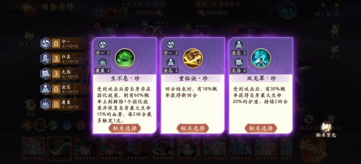 第一张图选择后天,第二选择双龙,第三选择魂愈术,打法是4包二,太白给白骨刷大,第一回合不减员就能过,前提是白骨能秒肉,否则回合不够,第一回合打不过那就没办法了,白骨伤害不够就堆点爆伤试试