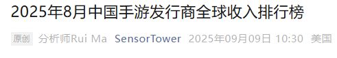 就在刚刚(2025/9/9/10:30),SensorTower发布了今年8月中国手游发行商全球收入排行榜,并附图中国手游发行商收入TOP30与中国AppStore手游收入TOP20。