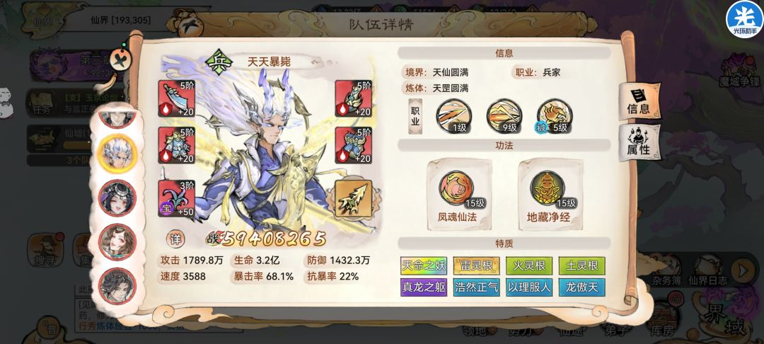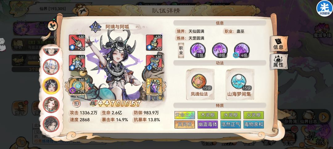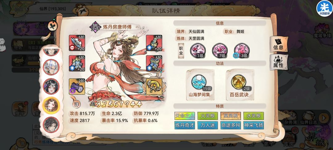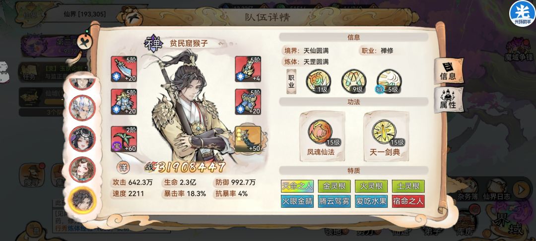 。(比如队伍三个明光,比如卫寒是唯一一个双输出功法的,比如猴子仙魔都没转,红尘三千也没有,阿璃命中不够没毒触发猴子紫天命,猴子捡点破烂就上场了