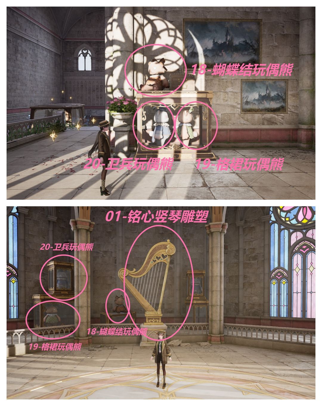 18-蝴蝶结玩偶熊、19格裙玩偶熊、20-卫兵玩偶熊(传送锚点菲洛米亚女王行宫遗迹地下入口进入副本到达激活点行宫旧苑、玩偶陈列馆/行宫内的遗迹洞窟等均可获得)