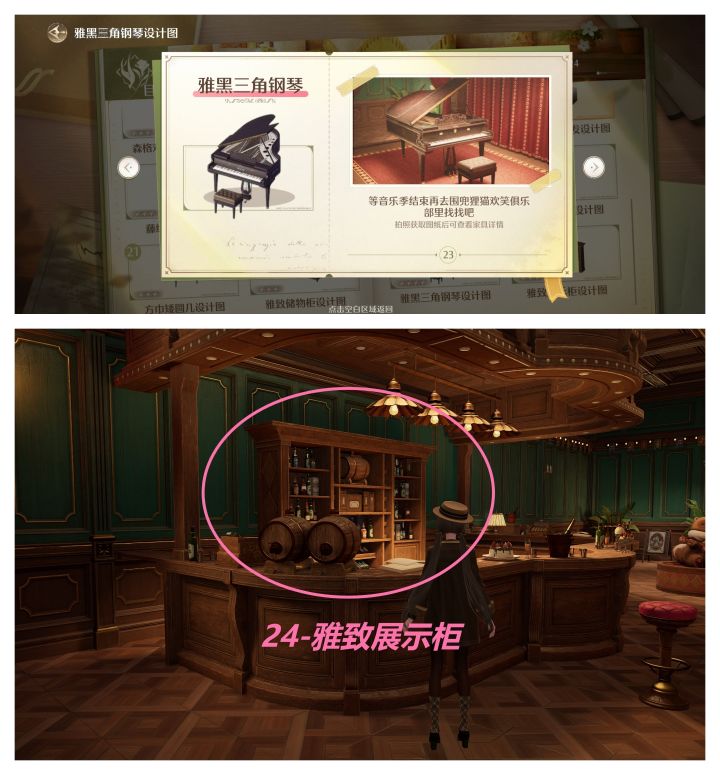 23-雅黑三角钢琴(钢琴被借用到活动“指尖的回想”作为奥罗尔的钢琴了,目前不在围兜狸猫欢笑俱乐部内,官方提示音乐季结束后可获得)