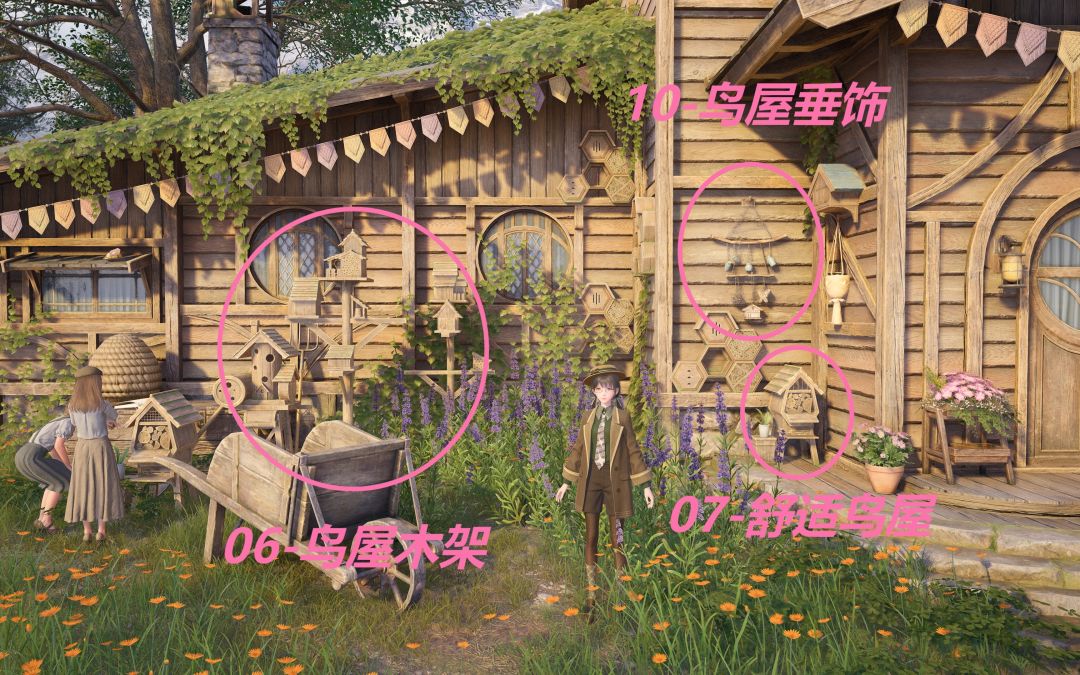 06-鸟屋木架、07-舒适鸟屋、10-鸟屋垂饰(捕虫小屋门口)
