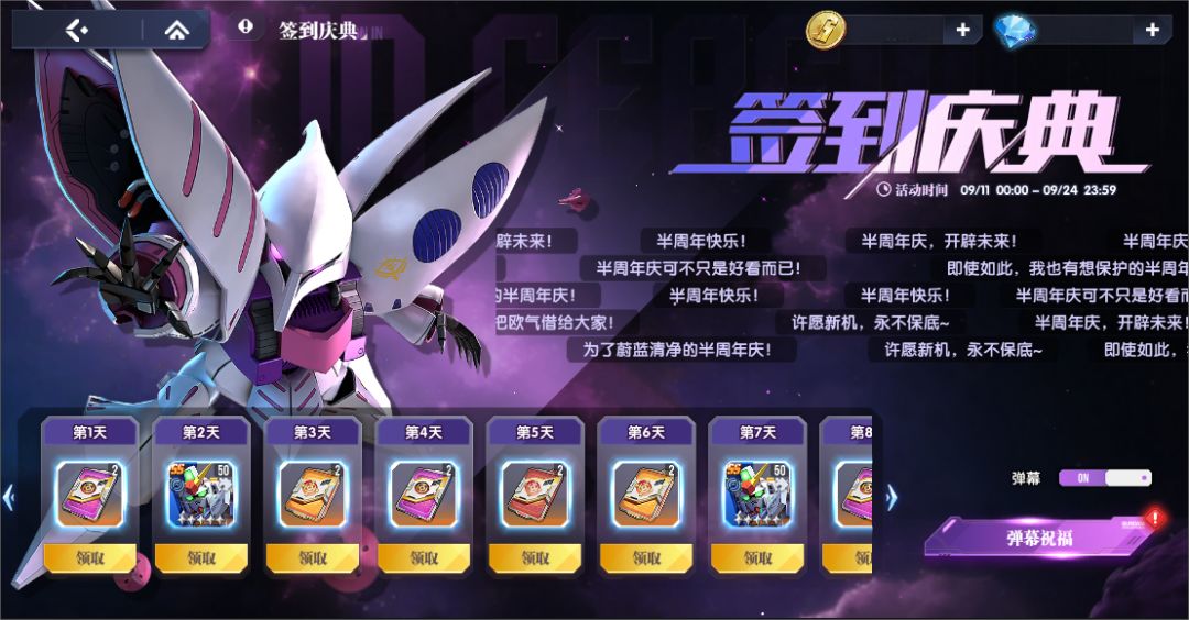 活动期间,指挥官只要每天登录签到游戏,即可获取包含【活动机体补给许可】、【超级高达】等在内的各种丰厚奖励!通过弹幕向其他指挥官送出您的周年庆祝福,还可获取钻石奖励(每天一次哟~)。