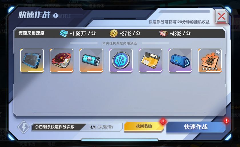 9月10日维护后,只要通关指定主线剧情关卡,【挂机收益】和【快速作战】就会额外产出「哈罗能量电池」「战舰战斗数据」「机师战斗数据」!这些新增的道具产出将为指挥官的战力成长、机体培养提供更多助力,让养成过程更得心应手~