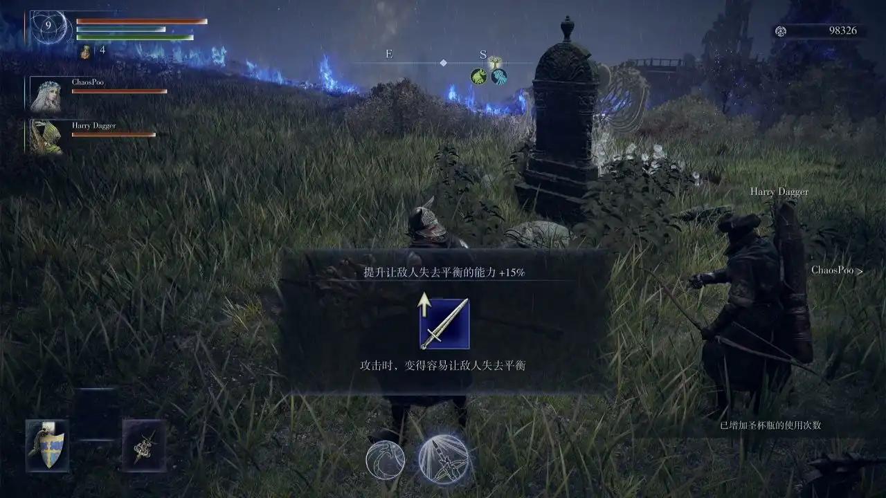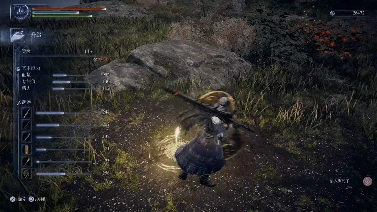 击杀BOSS后,即可出现升级点。平时在地图上也会刷新固定的黄色圆圈升级点。通过使用卢恩来提升等级(最多LV15),从而一键提升生命值、专注值、精力,以及你所有武器装备的攻击力。