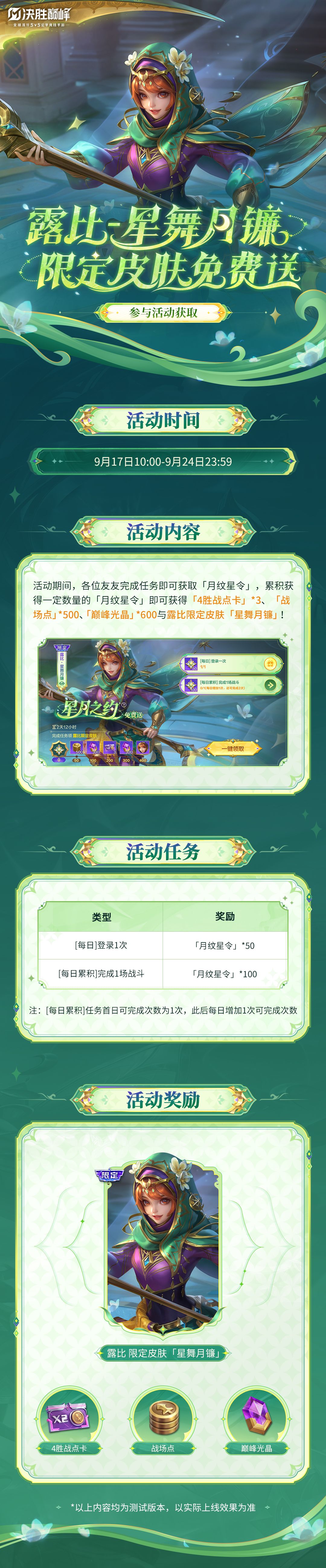 【活动说明】活动期间,玩家们可以在「星月之约」活动页面完成任务,累积获得一定数量的「月纹星令」即可获得「4胜战点卡」*3、「战场点」*500、「巅峰光晶」*600与露比限定皮肤「星舞月镰」!