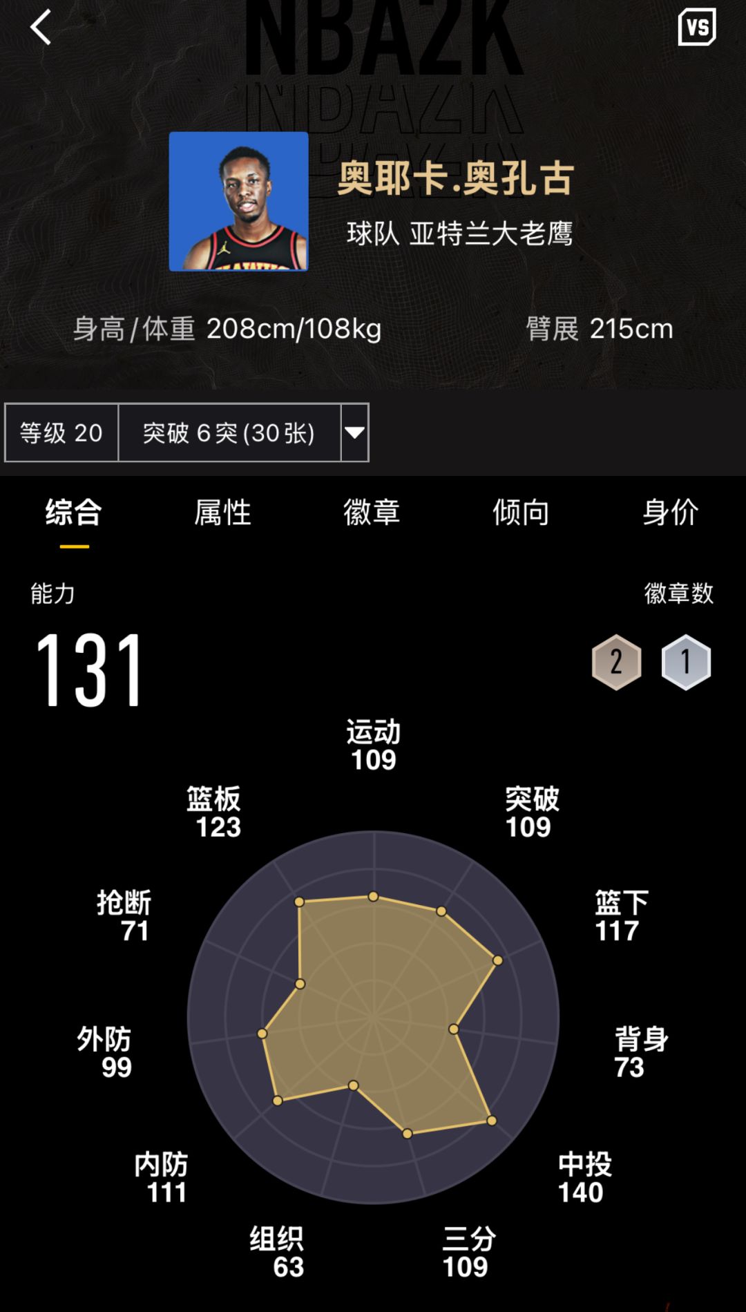 8.奥孔古,有银冲板大师,防守和篮板在线,甚至可以打一打篮下,三分数值低但是热区多。【奥耶卡.奥孔古(131↓124)投篮智商133↓112 进攻稳定性145↓101造成对手犯规86↓67】