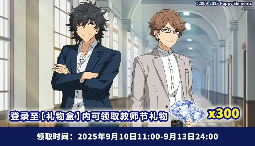制作人重新登录游戏后可在【礼物盒】内领取【钻石x300】的教师节礼物