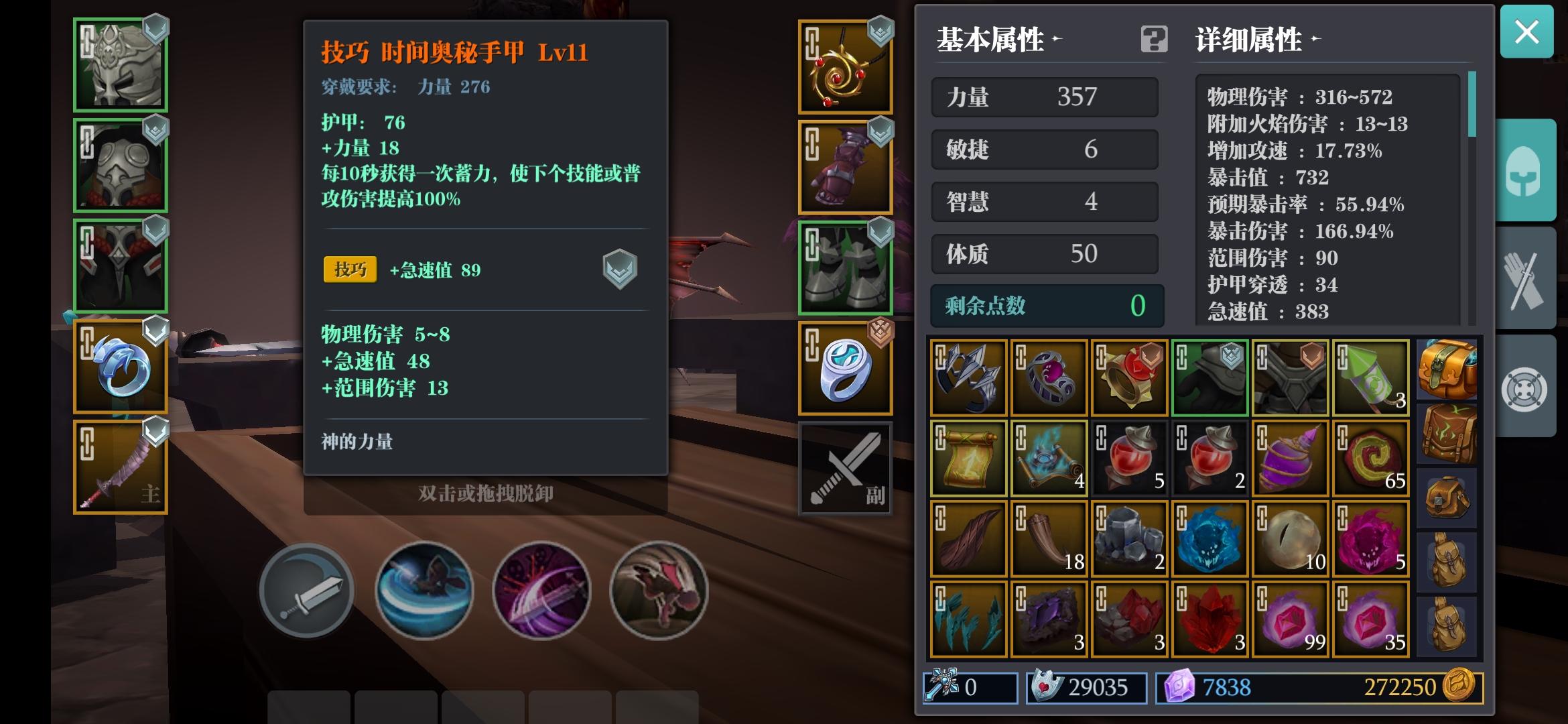 整整一个月啊,印记商店刷了一个月了,神秘商人那也去赌了几万的印记,就出了这么个玩意,今天也攒足了材料做了时间手,可惜是急速的,行吧,总好过没有,打怪是真心爽,以前暴击伤害一千出头,现在都两千多,大大减低了暴毙的可能,刷起噩梦也好多了,之后应该做什么装备大佬们给点意见,我是首充玩家