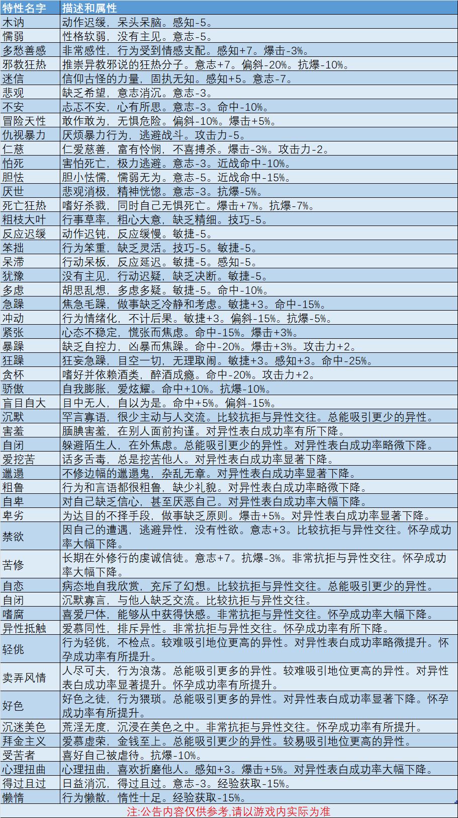 【历练可遗忘特性列表】