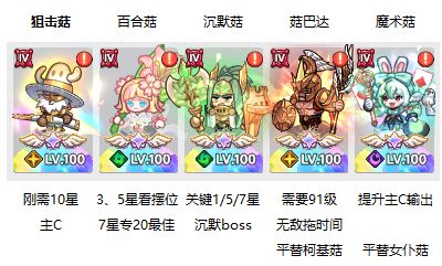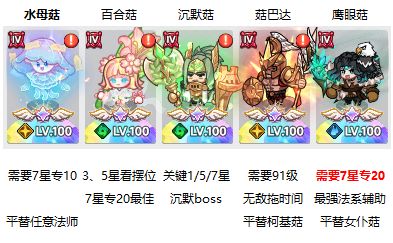 辅助推荐:百合菇>魔术菇>女仆菇=鹰眼菇(法系专属丨7星专武+20)>祭司菇=天使菇