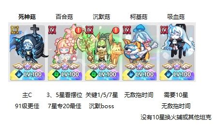 ④阵容方面,前期可使用炼金菇作为过渡,同时主力培养鹰眼菇。待鹰眼菇达到7星专武20后,后期可将主C替换为上限更高的水母菇或绘卷菇,以进一步提升整体输出和阵容强度;