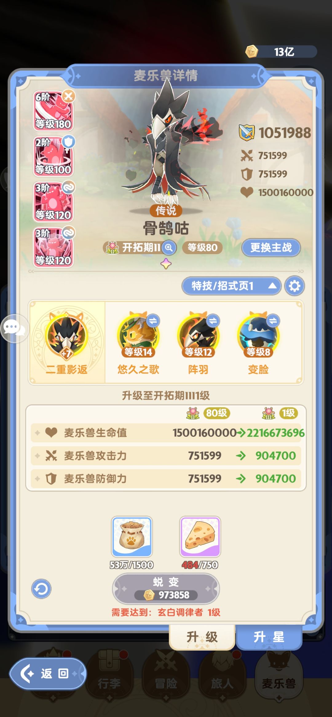 宠物:彩1+14猫+12阵羽+8变脸,闪闪只多出80个,作为零氪闪闪一般都比较缺,就看愿不愿意把钻石花在抽宠,咕咕碎片总量是330片,算上本体335片是刚好达到四代宠彩1+9特技的量,这一转用了9万钻石砸的宠物,别说欧不欧的,欧的人都10变脸,我只在平均值上。