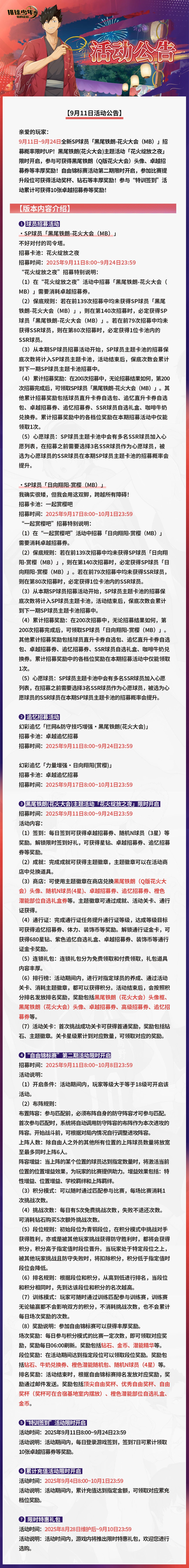9月11日 ~ 9月24日,全新SP球员「黑尾铁朗-花火大会(MB)」招募概率限时UP!黑尾铁朗(花火大会)主题活动「花火绽放之夜」限时开启,参与可获得黑尾铁朗(Q版花火大会)头像、卓越招募券等丰厚奖励!
