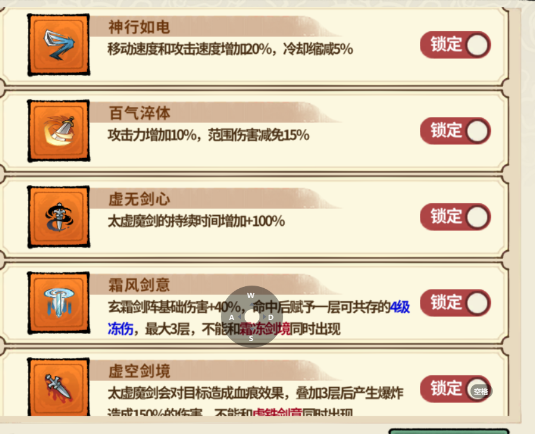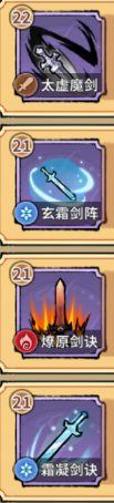 技能搭配看下图,然后雕文买4个衡打上4个技能,手动可以少打1 2个,天虚魔剑,玄霜剑阵和霜凝剑诀再打3个光,剩下5个位置打上杀,霹,昭,河这种整体增伤类的雕文,不同颜色可以同时触发
