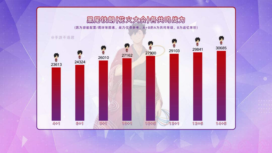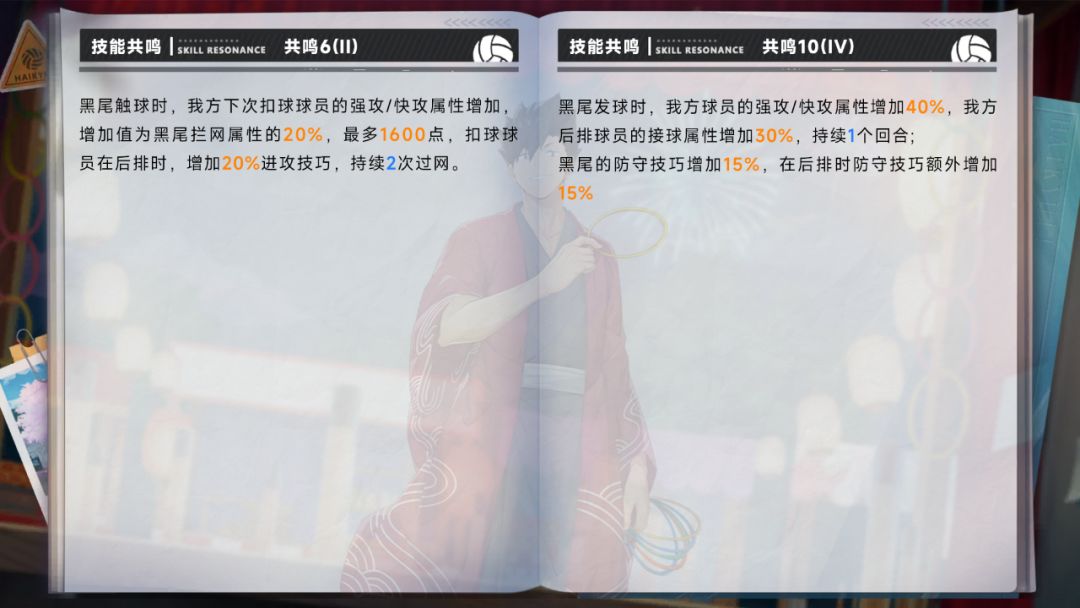 黑尾铁朗(花火大会)在后排时,我方球员的防守技巧增加14%/17%/20%,黑尾铁朗(花火大会)接球的威力增加,增加值为接球属性的45%;