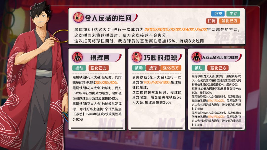 黑尾铁朗(花火大会)在前排时,我方球员的进攻技巧增加14%/17%/20%,黑尾铁朗(花火大会)拦网的威力增加,增加值为拦网属性的45%;