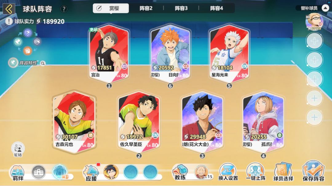 目前推荐这么组,等改版不限位置后可以把OP位换成SP月岛,这样阵容的攻防能力和给对方减益的能力会到达极致。黑尾建议2号/3号位,这样在拦网后轮转接球,收益最大化。