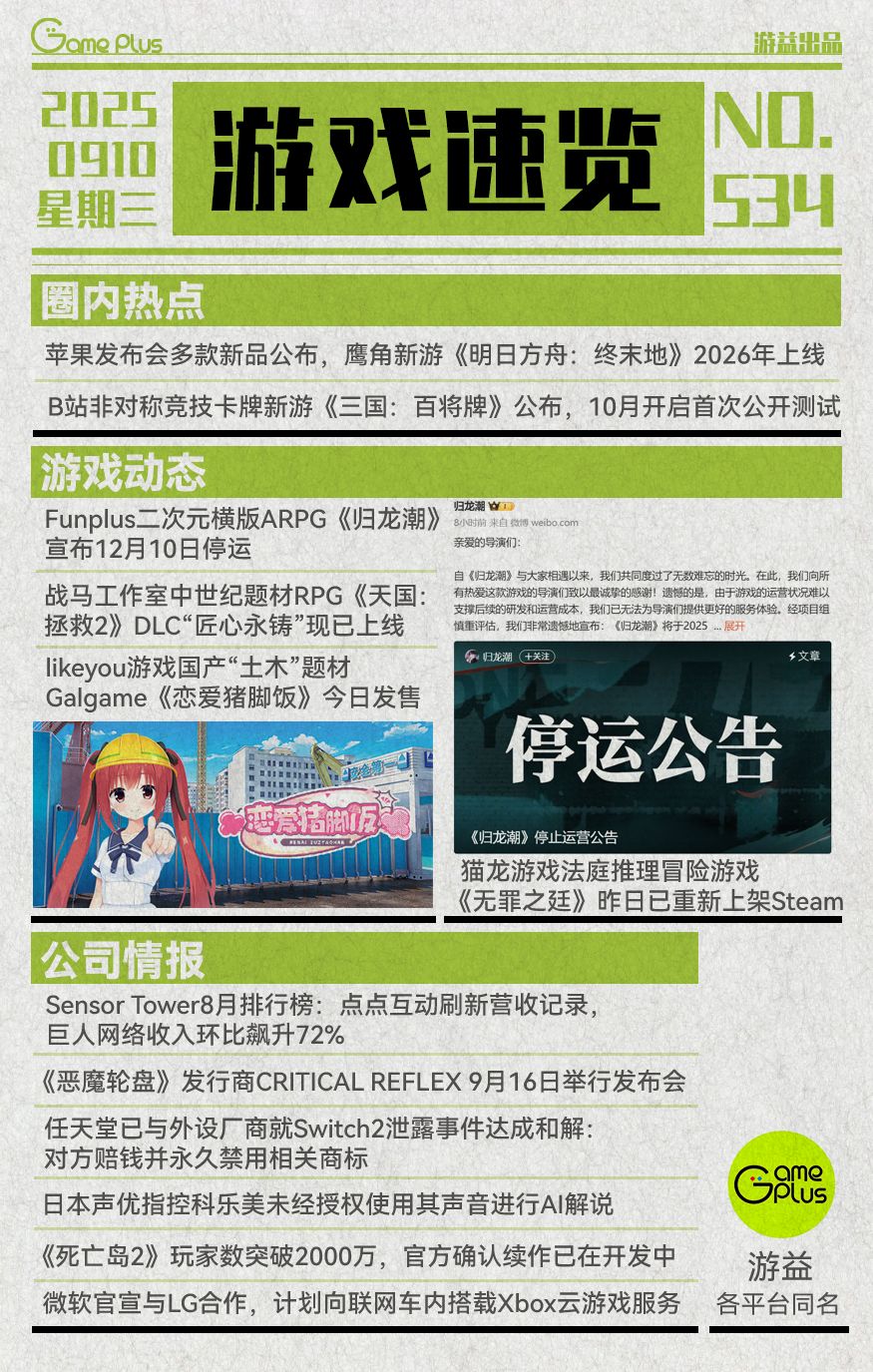 1.Funplus二次元横版ARPG《归龙潮》宣布12月10日停运