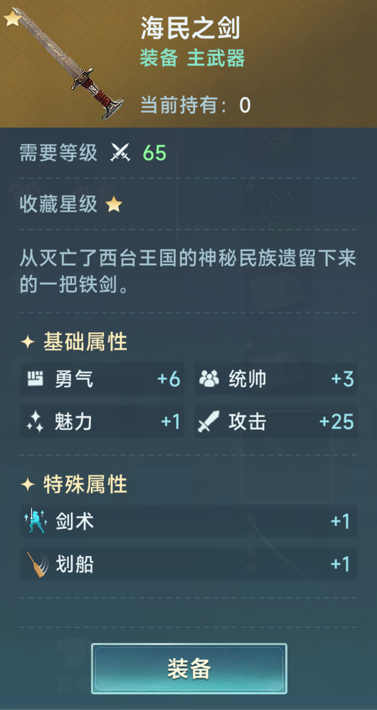 主武器,毋庸置疑的海民之剑,65级就能获得,在新版本甚至可以升级到100级,技能完美适配排船,唯一的问题是需要考古技能10,开锁8,搜索8才能获得。