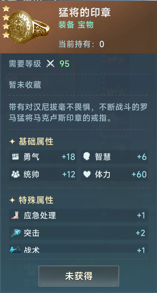 最后是宝物,宝物方面是第一次出现了多种选择,猛将印章是毋庸置疑的毕业装备,但是获取难度太大了,需要开海军叛将的宝箱机率获得,集齐16个的难度很大。