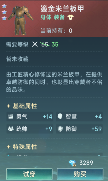 衣服推荐鎏金米兰板甲,这是一个65-30级的装备,购买就是3星,接近于55级4星的防御力,而且35级就能使用,算是前期越级练级神器。但是因为需要300星光,所以如果不愿意购买的可以使用骑士板甲将就用用。骑士板甲是首充获得,35级的4星装备也够用了。