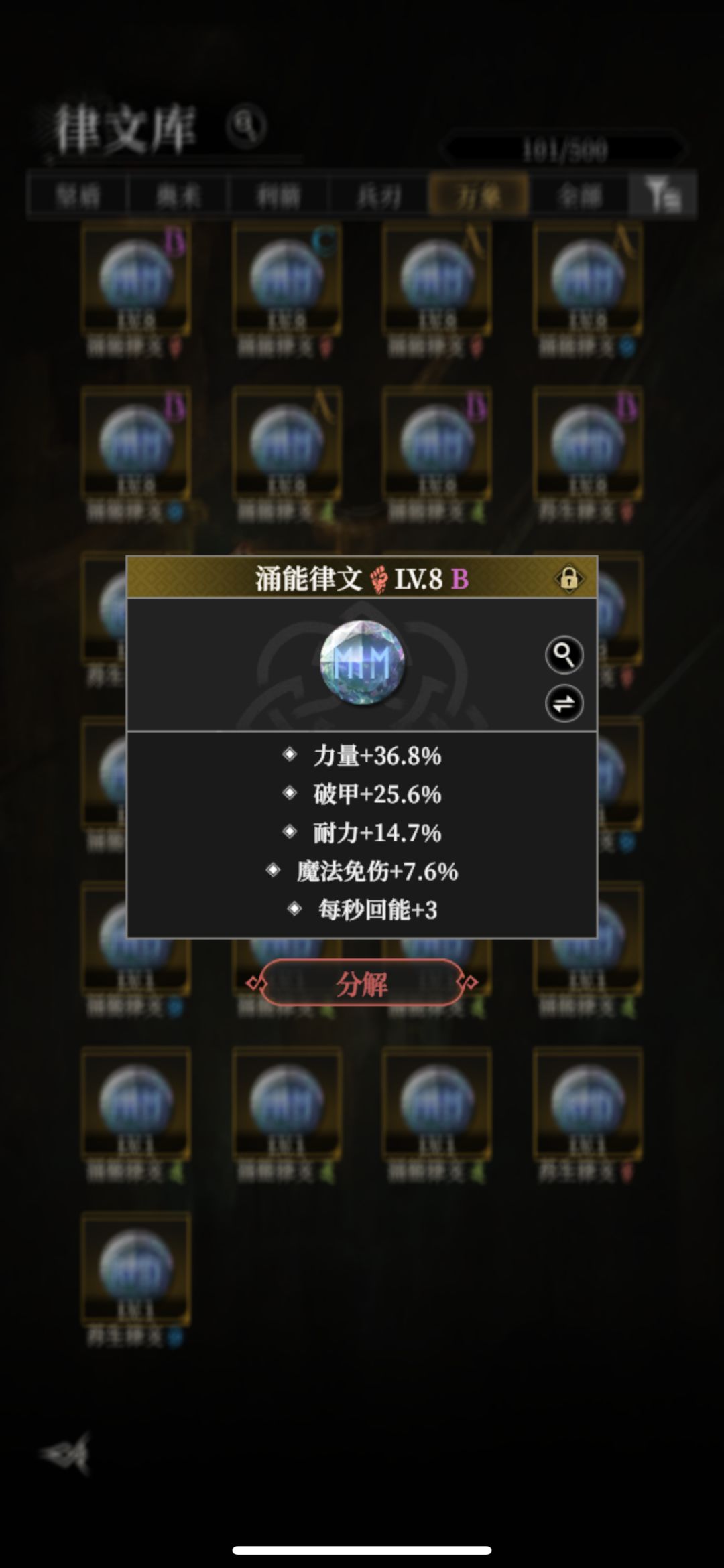 1.律文升级:分解各级律文可以获得始源晶尘,始源晶尘用来升级律文。律文也可以直接用来升级,和分解的始源晶尘提供的经验相同。
