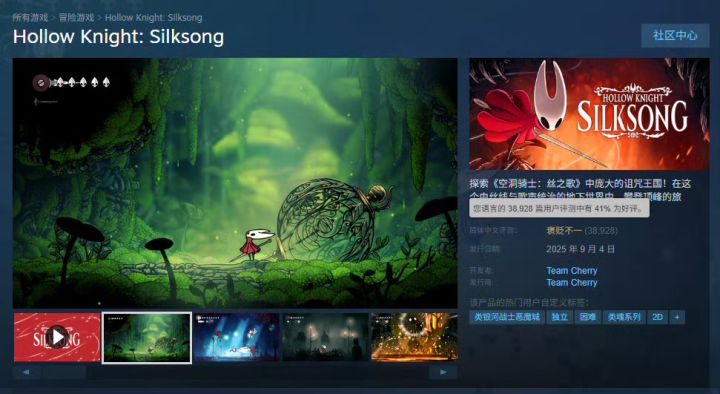 《空洞骑士:丝之歌》Steam国区评价从此前的“多半差评(38%好评率)”回升至“褒贬不一(41%好评率)”。近期给出好评的玩家对于游戏的体量、战斗、玩法等内容感到满意,不过也有人建议还是等解决弊端之后再入手。