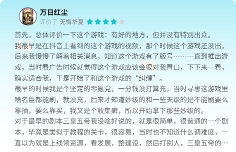 评价君:老狼文风固定、格式统一,虽然可能不会给人太多新鲜感,但评价内容本身的“堆料”特别足。大多数的情况下,哪怕你完全不了解这款游戏,只要你看完老狼干练简要的评价,便能大致明白这是款什么样的游戏、玩法如何、付费程度又是怎么样等等,相信这也是能得到这么多玩家认可并喜爱的理由之一。