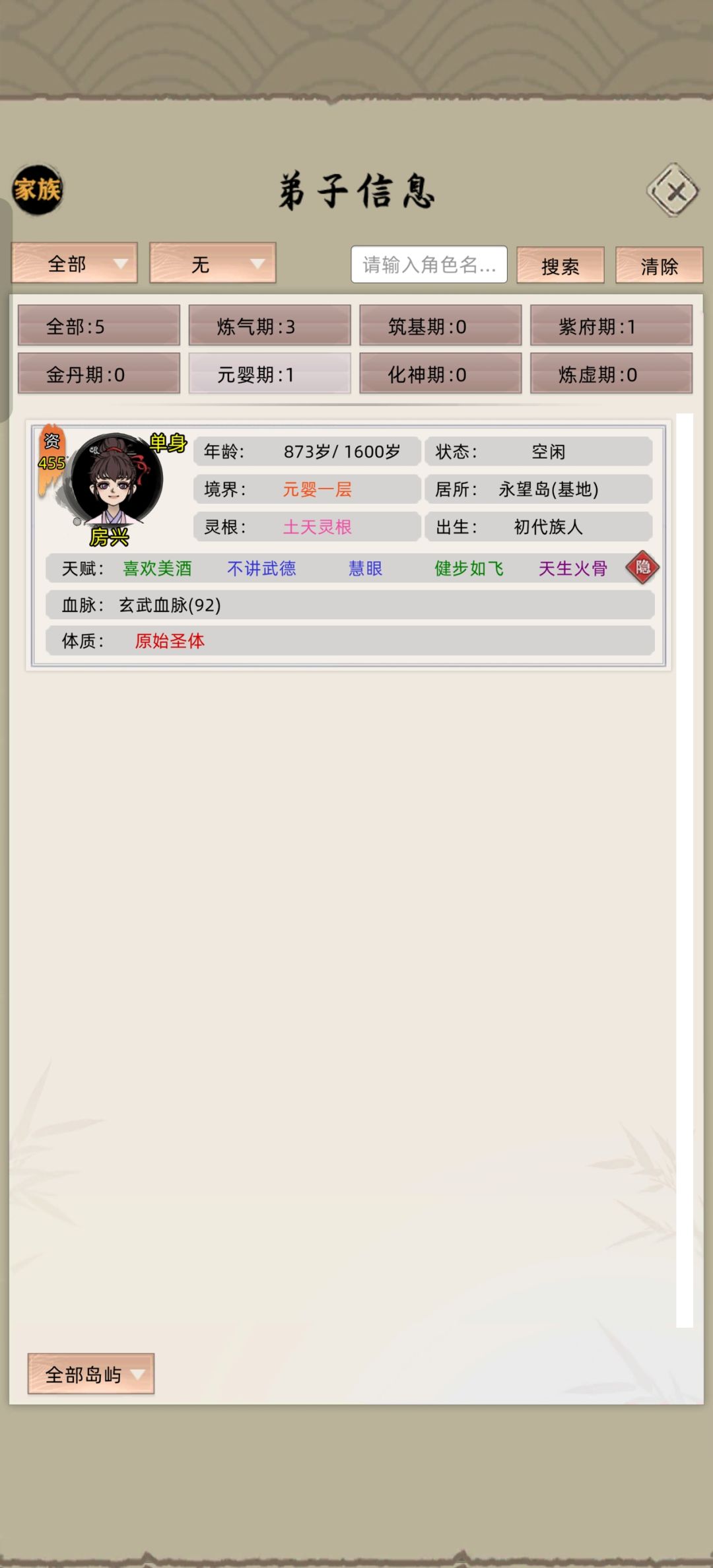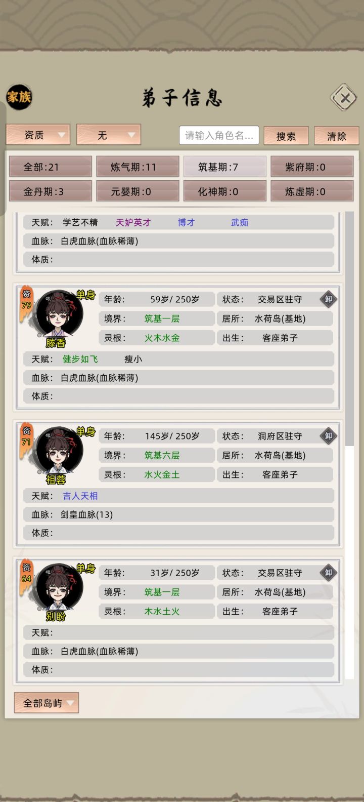 这个方法要用到我上面的数字人化神方法,开局的时候选一个最底六阶的岛屿势力,放上我们的一个弟子,派遣我们的化神数字人,去攻打这个岛屿,打赢的一瞬间,点击暂停,点击岛屿选择分家,再点击岛屿点击查看,点击上交弟子,就会有大概率的看见一个高资质的元婴弟子,在等着你把它收编。阿巴阿巴![[表情_流口水]](https://img.tapimg.com/market/images/f0320a0494447e27b7123a94b6cbcecf.png)