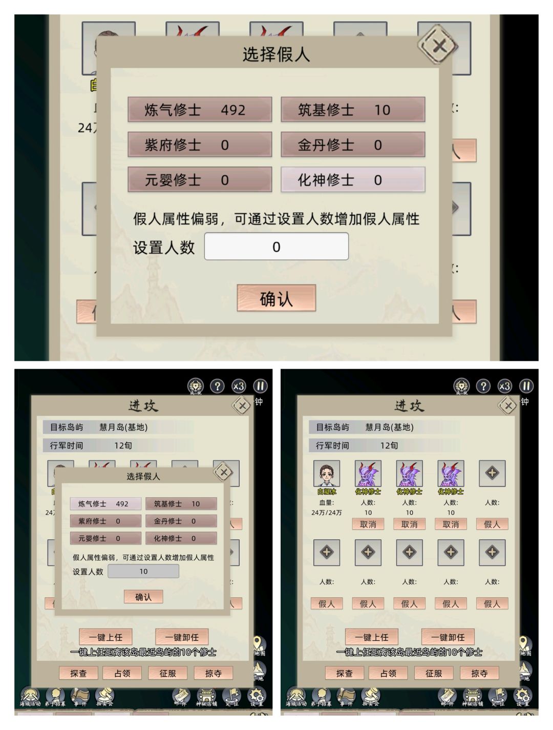 攻打岛屿的时候,自己随便上个弟子,点击派遣数字人,然后点击筑基,设置人数十个,再点击化神,点击确定,就拥有了强大的化神修士帮你打工。阿巴阿巴![[表情_流口水]](https://img.tapimg.com/market/images/f0320a0494447e27b7123a94b6cbcecf.png)