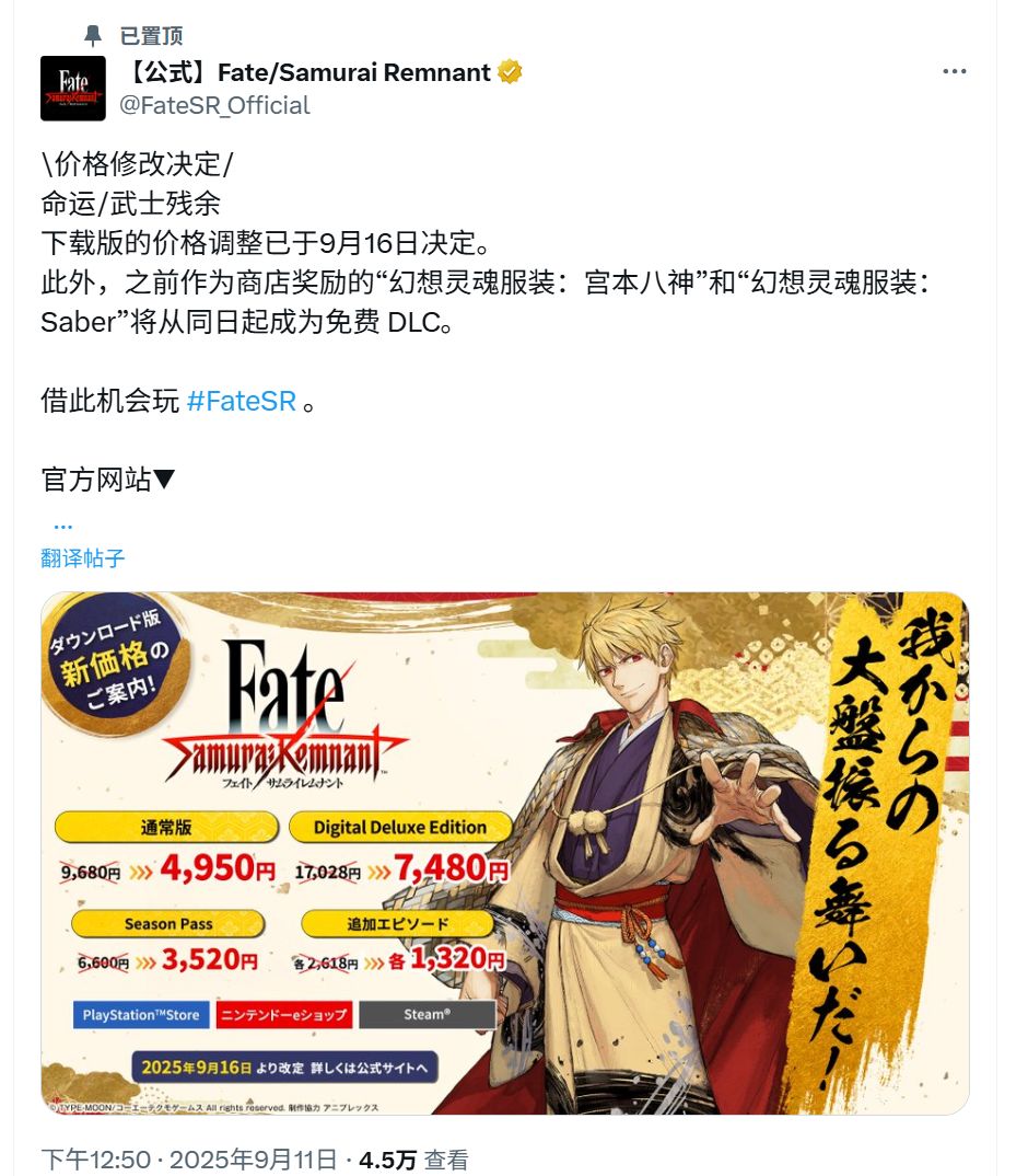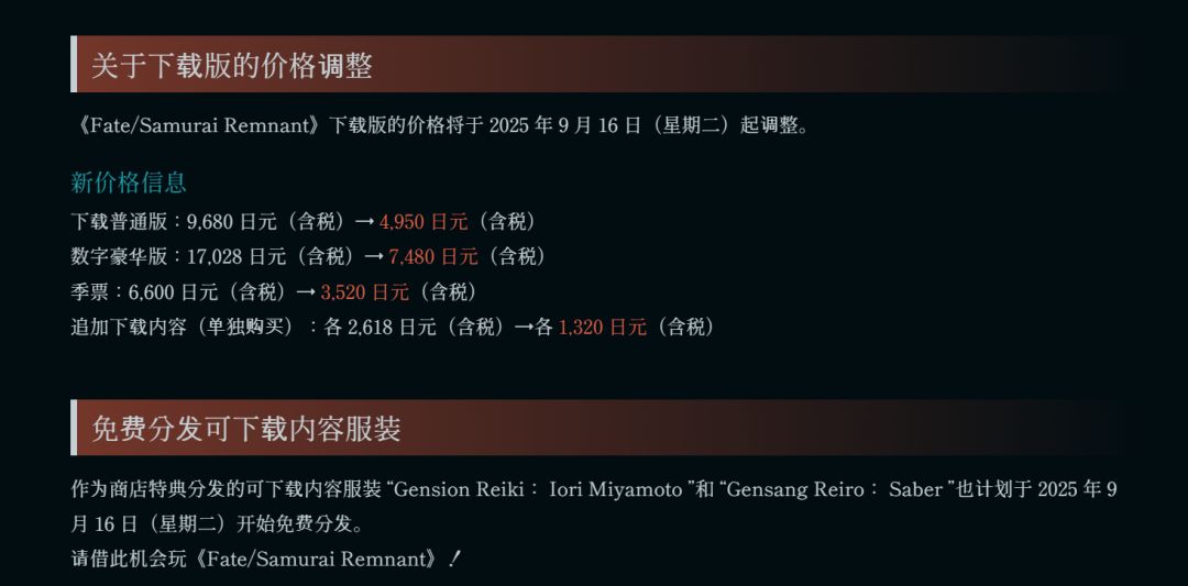就在今天,《Fate/Samurai Remnant》官方发布公告,宣布游戏《Fate/Samurai Remnant》的下载版将于9月16号迎来价格下调!