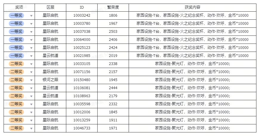 一等奖3名:家园设施-T台,家园设施-火之纪念奖杯,动作-欢呼,金币*10000;