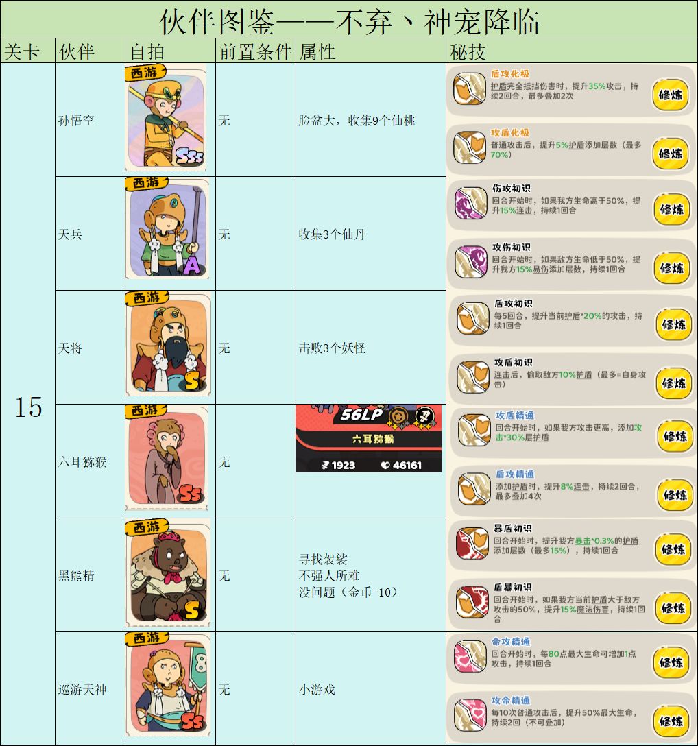 在冒险前50关与伙伴交流(战斗)后可以解锁伙伴,一些固定的伙伴会解锁对应的密友,密友的额外属性加成达到了100%,在前期的提升是非常大的。有些伙伴需要前置条件,我这里也总结了72个伙伴的对应关卡、前置条件、战力及对应的秘技,数据都是内测的,公测如修改会及时更新。有些伙伴的战力很高,初见很可能打不过,可以等属性高一些再回头解锁即可,不容易坐牢。难打的伙伴可以针对他的流派来点出克制类技能再打,会简单不少,点名菩提祖师,闪避枷锁点满再打。
