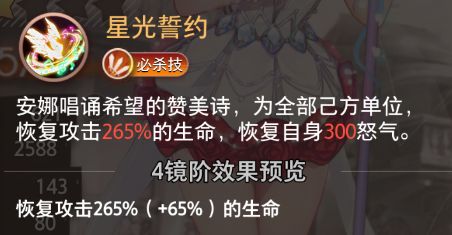安娜唱诵希望的赞美诗,为全部己方单位,恢复攻击265%的生命,恢复自身300怒气。