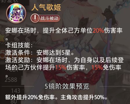 激活奖励:安娜在场时,为自身以及后续登场的己方伙伴提升15%伤害率,15%免伤率。